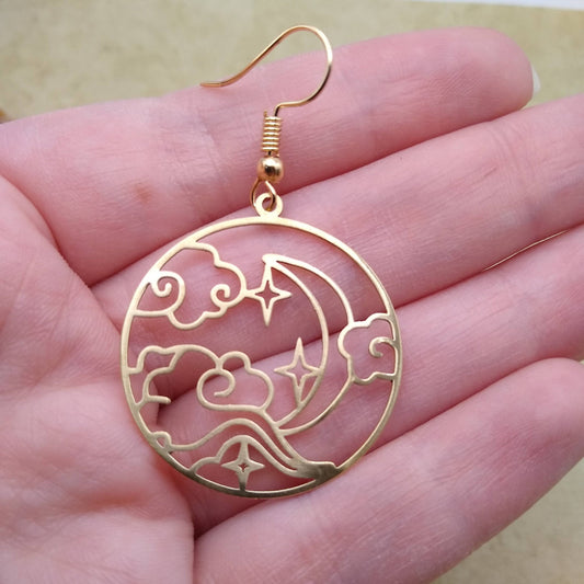 Brass Circle Clouds, Stars & Moon Earrings